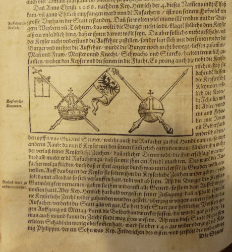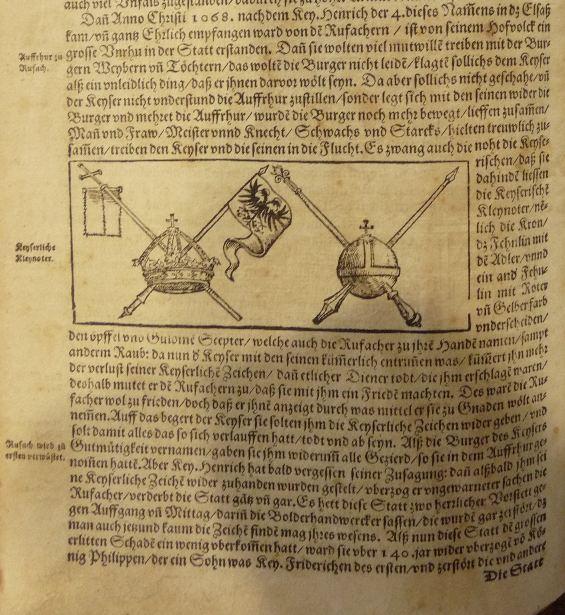 Dann Anno Christi 1068. nach dem Keyser Henrich der 4. dieses Nammens in das Elsaß kam / und gantz Ehrlich empfangen ward von den Rufachern / ist von seinem Hofvolck ein grosse Unrhu in der Statt erstanden. Dann sie wollten viel mutwillen treiben mit der Burgern Weybern und Töchtern / das wolten die Burger nicht leiden / klagten sollichs dem Keyser alß ein unleidlich ding / daß er ihnen darvor wölt seyn. Da aber sollichs nicht geschahe, und der Keyser nicht understund die Auffrhur zustillen / sonder legt sich mit den seinen wider die Burger und mehret die Auffrhur / wurden die Burger noch mehr bewegt / lieffen zusammen / Mann und Fraw / Meister unnd Knecht / Schwachs und Starcks / hielten treuwlich zusammen / treiben den Keyser und die seinen in die Flucht. Es zwang auch die noht die Keyserischen / daß sie dahinden liessen die Keyserischen Kleynoter / nemlich die Kron / das Fehnlin mit dem Adler / unnd ein ander Fehnlin mit Roter und Gelber farb underscheiden / den apffel und Guldine Scepter / welche auch die Rufacher zu ihren Handen namen / sampt anderm Raub: da nun der Keyser mit den seinen kümmerlich entrunnen was / kümmert ihn mehr der verlust seiner Keyserlichen Zeichen / dann etlicher Diener todt / die ihm erschlagen waren / deshalb mutet er den Rufachern zu / dass sie mit ihm ein Frieden machten. Des waren die Rufacher wol zu frieden / doch daß er ihnen anzeigt durch was mittel er sie zu Gnaden wölt annemmen. Auf das begert der Keyser sie sollten ihm die Keyserliche Zeichen wider geben / und solt damit alles das so sich verlauffen hatt / todt und ab seyn. Als die Burger des Keysers Gutmütigkeit vernamen / gaben sie ihm widerumm alle Gezierd / so sie in dem Auffrhur genommen hatten. Aber Keyser Heinrch hat bald vergessen seine Zusagung: dann alssbald ihm seine Keyserlich Zeichen wider zuhanden wurden gestellt / uberzog er ungewarneter sachen die Rufacher / verderbt die Statt gantz und gar. Es hett diese Statt zwo herrlicher Vorstett gegen Auffgand und Mittag / darin die Golderhandwercker sassen / die wurden gar zerstört / dass man auch jetzund kaum die Zeichen finden mag ihres wesens.