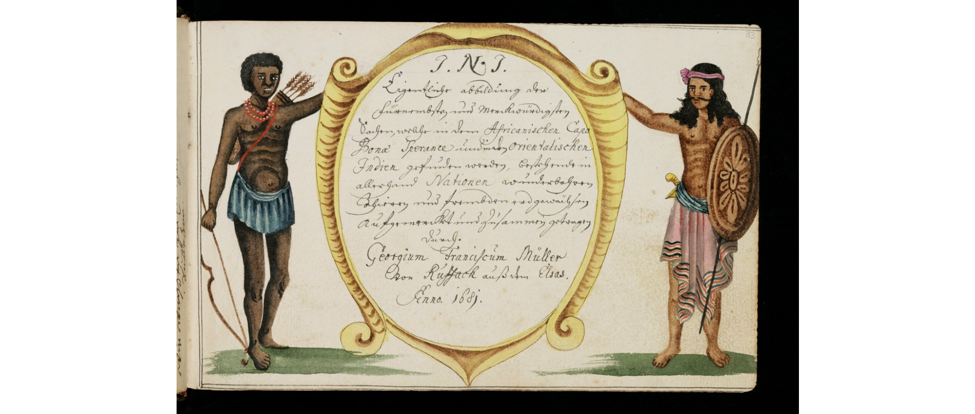 D’une insatiable curiosité, il décrit minutieusement dans son Récit de voyages, un carnet relié de près de 500 pages manuscrites, conservé sous le titre Müllers Reise Beschreibung nach Batavia, les paysages, les hommes, les animaux et les plantes qu’il a pu observer au long des vingt-trois ans, quatre mois et un jour de son périple au-delà des océans. Ce premier manuscrit n’est pas de sa main, sans doute rédigé par un secrétaire copiste, sous sa dictée ou d’après un original perdu. Le second carnet, qui contient les 87 planches semble lui, être de sa main, d’une écriture plus difficilement abordable.